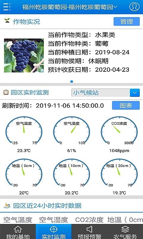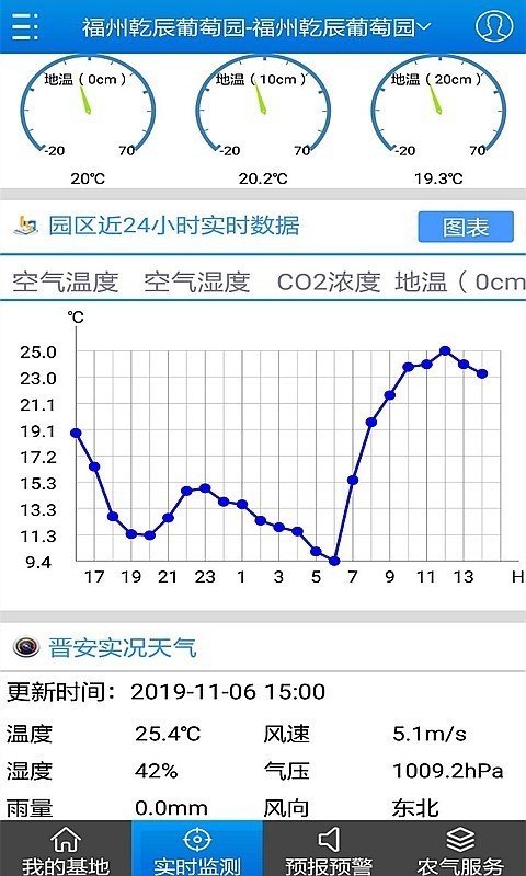 农气宝app以图表的方式直观的展示了基地内的空气温度、湿度和雨量、风速等数据。