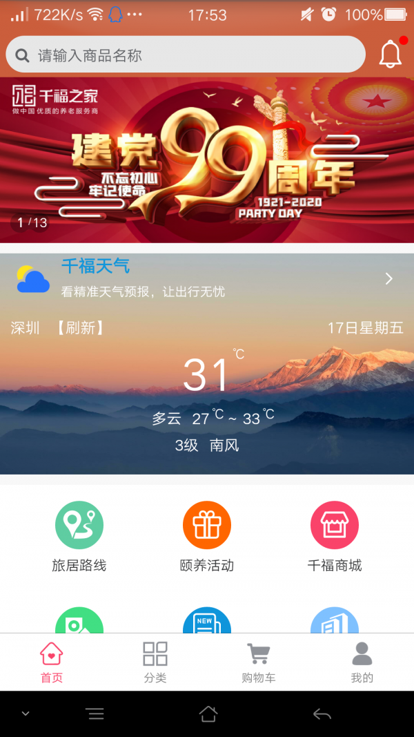 千福之家app是一款专业的养老服务平台,让老人朋友们也享受到互联网养老便捷式体验。千福之家APP旨在做中国优质养老服务商,这里还有活动展示、产品展示、动态资讯、旅居路线等功能版块,全力服务老年朋友们晚年美好生活,千福之家app包含商城购物、颐养、旅居路线、新闻资讯等多领域的内容,提供更贴心的养老服务,让老人也可以感受互联网便捷式购物体验,日常生活用品、保健品等都有,都是围绕老人带来的线上购物商品,适合老人购买使用;有带来商品分类信息以及购物车功能,在选购商品的时候就能更方便,也能够更好的帮助挑选合适的商品,进行商品价格比较;还有非常多老人感兴趣的优惠活动可以参加,在任意时间都可以使用优惠价格购买商品。