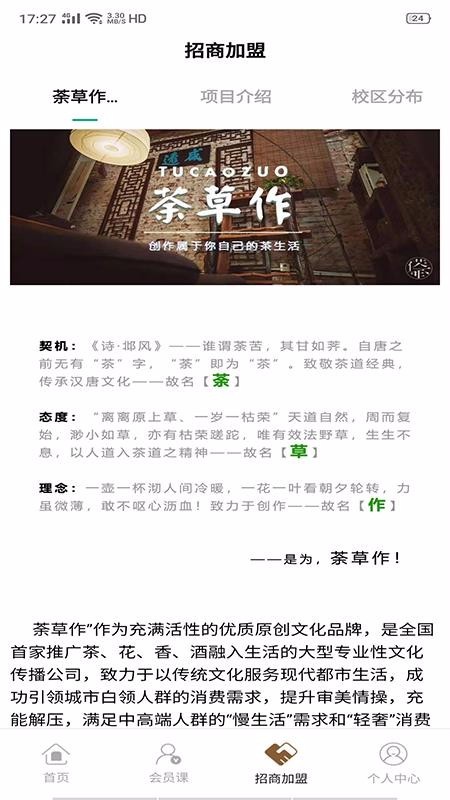 荼草作是一款专门的茶文化学习app,对于品有兴趣的人可以在这里系统的学习茶文化,可以从历史的源头开始学习,对于经营茶产品的人而言,这里更有着优质的招商加盟项目资源可以查看,不仅可以清楚项目的介绍而且能够了解项目的位置分布,有兴趣的话就能够到现场进行考察,非常的好用。但是归根结底这个应用最大的用处在于学习,当用户有空闲的时候就可以在这里学习大师的精品茶文化课程,对于品茶这门技艺感兴趣的人可以寻找线下的校区体验面对面的学习方式,这样的话有什么问题就能够得到大师的指点,非常不错,马上下载吧。