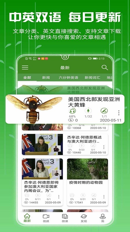 1、每周更新BBC话题,保证内容的时效性,并且带有中文翻译以及中文简介。