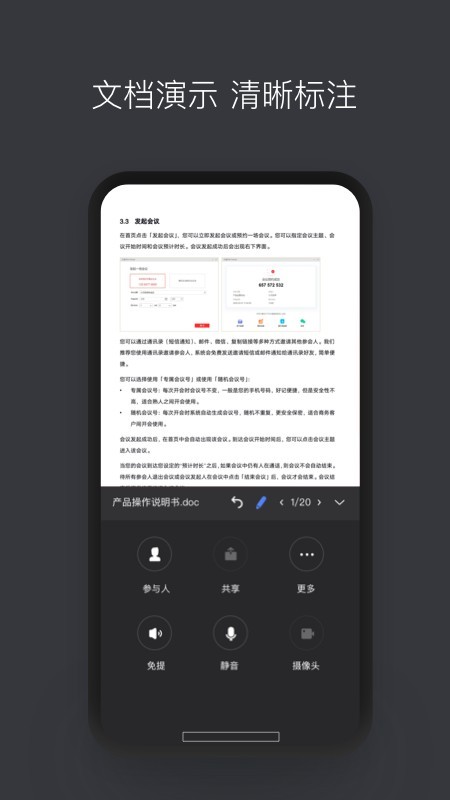 - 文档演示:随时将Word、PPT、PDF等文件共享到会议中,并实时演示,同步翻页和标注