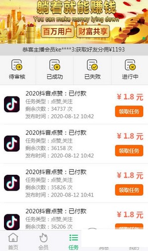 2、任务种类包括抖音、快手等短视频点赞、关注、收藏等简单任务;