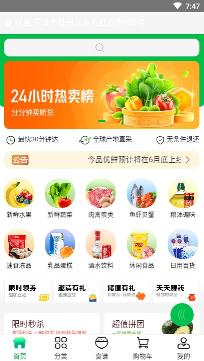 今品优鲜app:专门为你提供各种生鲜好货让你无忧,不管是配送还是在线购买都十分方便,买生鲜也好,还是买速食以及水产还有肉食等等都可以帮你弄到手,总有你需要的好货商品帮你配送到家,不需要你太操心自己买不到或者是下单不及时不能够快速配送的问题了。为用户提供生鲜零售及配送服务。商品品类涵盖水果、蔬菜、肉蛋、水产、速食、乳饮、零食、粮油、日用百货等,全品类生鲜一站式购齐。