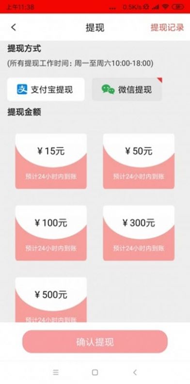 2、满15元起提,支持提现到微信/支付宝,24小时内到账。