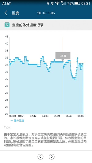 2、温度:监测宝宝体外温度,并伴有高温提醒,减少蒙被综合征和高烧不退等发生风险。