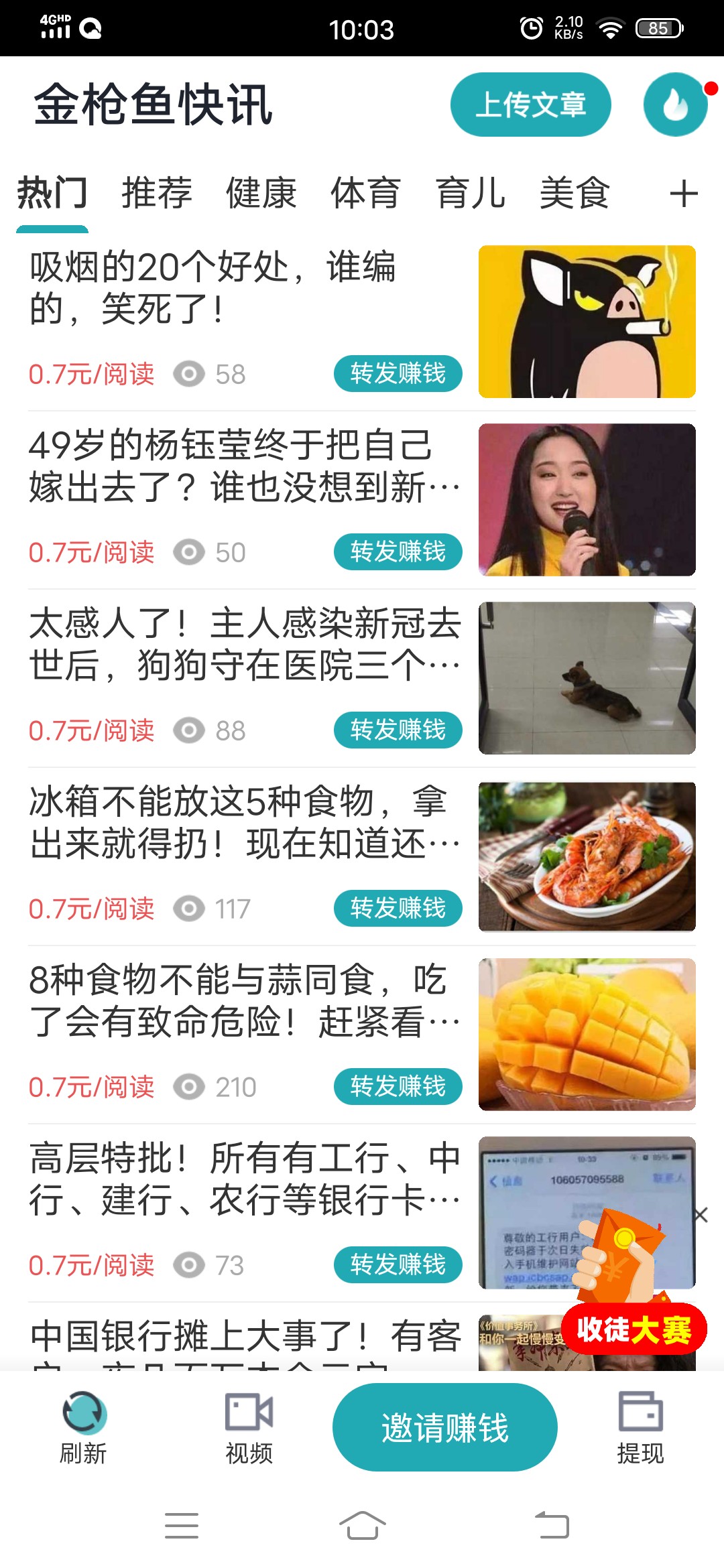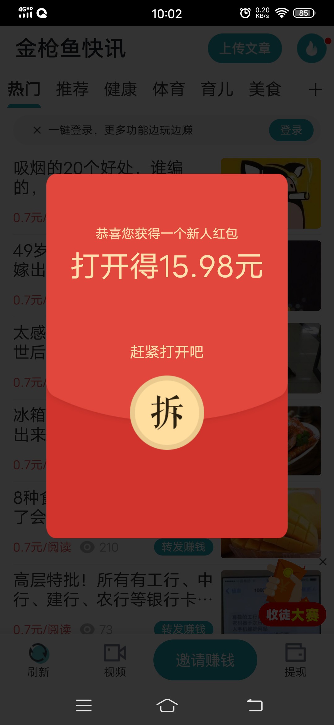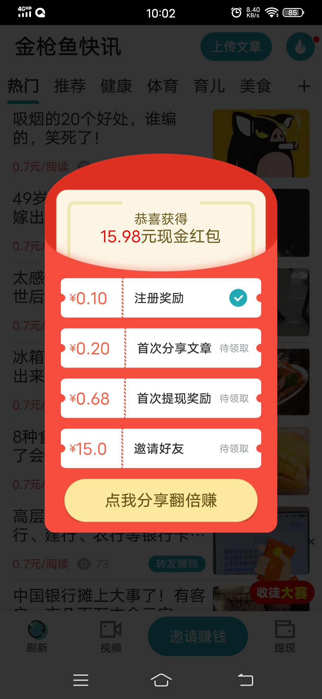 2、首次下载送0.92元,转发文章有效阅读单价0.7元,绿色健康区0.4元。