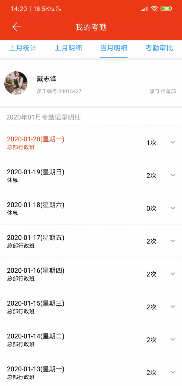 多样化的考勤数据记录,有着上月、当月、上周等时间段的考勤数据信息;