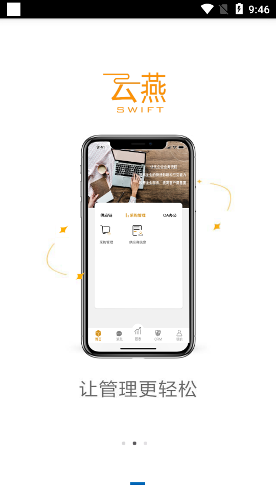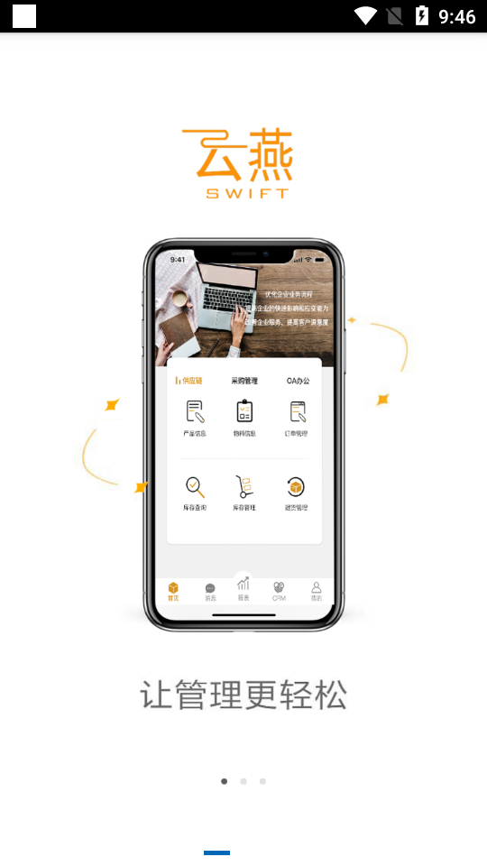 云燕是一款非常不错的商务办公类软件,用户可以通过云燕OA软件来提升工作效率,考勤打卡样样轻松,云燕OA企业办公系统,专为企业打造的运营管理工具。软件支持从进销存、CRM到OA等方面服务,提供订单管理、物料信息查询、库存管理、库存查询等功能,保证企业运营全程透明化,感兴趣的小伙伴们快来下载云燕app试试吧!