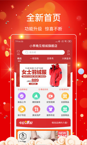 精选速购包括美妆护肤、精品家具、流行服饰、时尚鞋帽、运动户外、健康食品、饰品手表等七大种类。