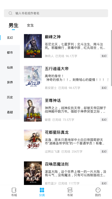 3、齐全的小说分类有玄幻、仙侠、悬疑、历史、异界等;