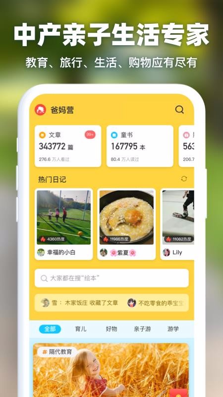 爸妈营app打造高质量的亲子社区平台,旨在为父母推送家庭教育资料、共享育儿经验、提供线上讨论场所等,让父母通过学习的方式成为更好的爸妈;非常多干活知识可以自由学习,涵盖旅游、生活、购物等多领域的干货知识,还有童书、分龄电影动画片等内容,并且带来的资料都是可以免费使用的;有效的提升孩子的生活管理让自己省心、省力又省钱;爸妈营手机版拥有超多儿童观看的书籍,用户可以让孩子自己选择想要观看的图书,点击获取,为孩子阅读让孩子从小就感受文化的熏陶;同时覆盖海量亲子游玩、游学目的地,用户可以和孩子商量选择想要去的亲子互动地,参与互动游戏拉近孩子与自己的距离。