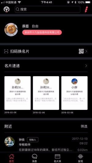 名猩片全新的名片应用,专注于名片功能,为用户追求极致生活。用户在这里可以进行各种名片交换,让你认识更多的有趣的人物,实用名片非常的方便、高效,还可以进行附近搜索,找到和自己志同道合的朋友吧,大家可以在手机通过定位附近的人发现你需要的名片以及互相扫码交换名片,名猩片安卓版通常用于企业经理、主管等高职位人士的社交,如果你也是一名成功人士那就下载使用吧。