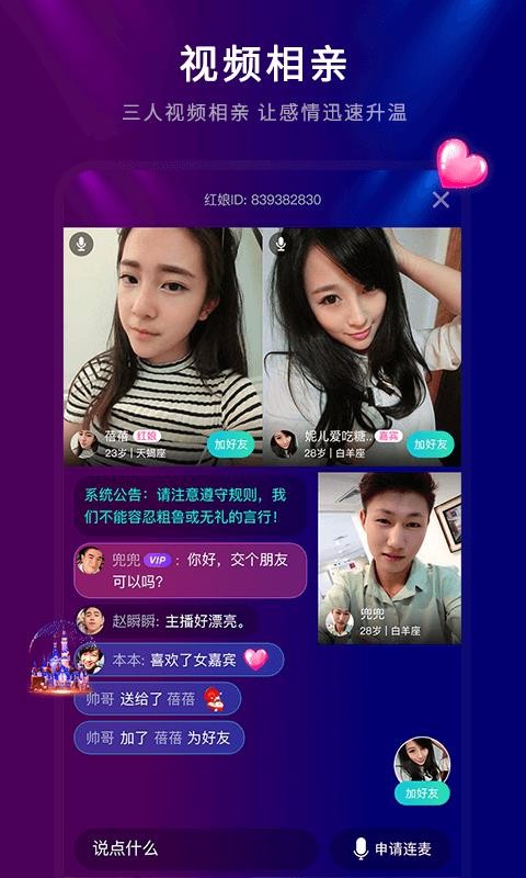 1、三人视频同台互动相亲,有专业靠谱的红娘作为担保,能够更放心的与心仪对象互动聊天;