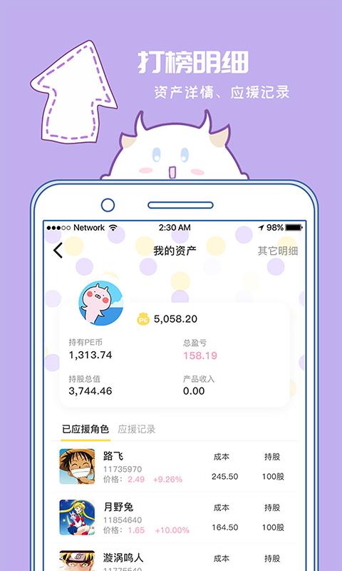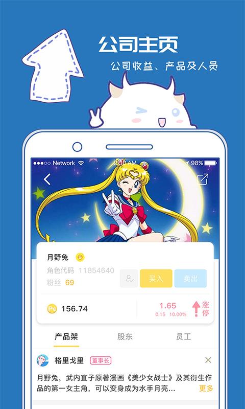 2、可以查看应援角色的所有资料,还能查看该公司的股市涨跌情况;