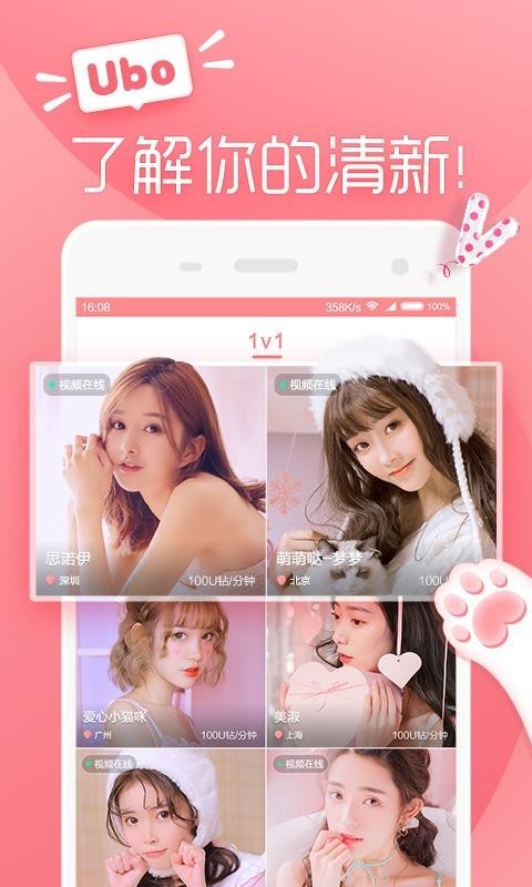 Ubo app是一款全新的互动聊天秀场,超级火爆的社交聊天app。云集众多单身男女,类型多样,你喜欢的男神、女神类型这里全都有,综合型社交平台,支持文字、图片、语音、视频等聊天方式,不管你想要约会同城异性还是匿名社交、宣泄压力,这里都支持,想你所想,推荐符合你口味的交友对象,高效率开启,各种互动玩法全支持哦。 海星帅哥和美女扎堆的视频交友软件,让你挑花眼的约会软件。这里的美女不是千篇一律的网红,类型不一 ,有呆萌可爱的,性感霸气、令艳、风情的,适合有高标准,特殊喜好的你来约会女神哟。帅哥也有风趣、颜值高、高冷小奶狗类的,让你可以找到不一样的他,来这里看视频,聊天互动,告别脱单机率很高。快来下载体验吧。