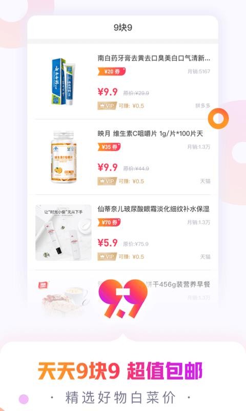 1.天天9块9:超值包邮,每天都有不错的推荐好物白菜的价值。