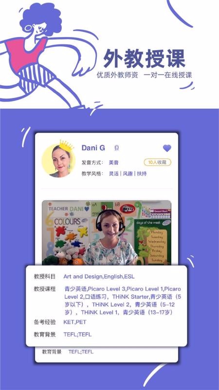 3、将喜欢的外教老师添加收藏夹,在下一次预约课程学习时即可查看带来的课程;