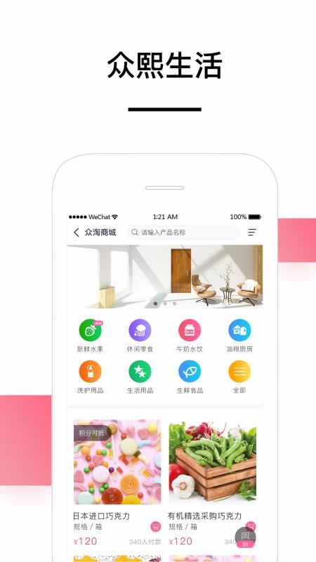 众熙生活圈app是一款能够满足用户生活消费和线上购物需求的掌上平台,平台上汇聚海量优质商品资源,各种各样的商品都有,绝对有你需要的商品;众熙生活圈为你推荐的商品资源丰富,涵盖有新鲜水果、休闲零食、牛奶水饺、洗护用品、生活用品、生鲜食品等等,非常的全面,满足用户的生活购物需求,在线即可购买自己需要的商品,非常的方便,让你足不出户就能买到心仪的商品,节约用户的时间,为用户的生活提供许多便利,让生活更轻松;需要的用户可以来下载体验哦。