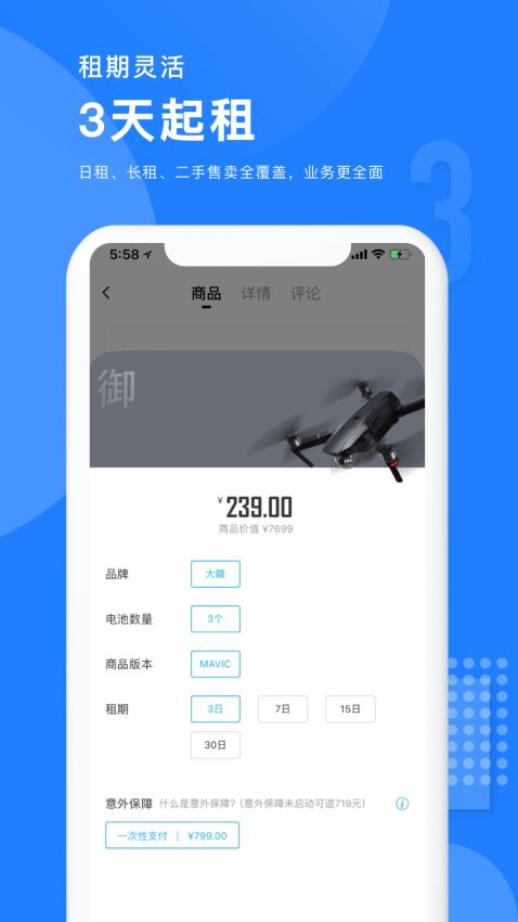 租赁服务功能,拥有各种产品,有手机、笔记本、汽车、无人机等;