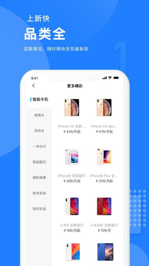产品种类全,拥有八大类产品;租期灵活,提供四种租期选择;