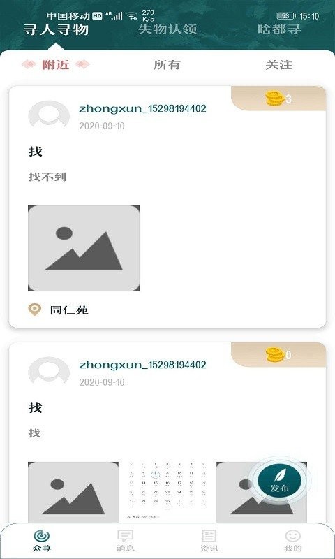 众荨app:不管你什么东西丢了都可以在这里帮你去寻找到,专业寻找东西的平台,操作起来简单还方便,以后就不用总是担心自己东西丢了找不回来了啊,那种失而复得的心情真的妙不可言,所以希望平台可以快速发展起来为更多人谋取到福利。在这里用户随时可以在线发布自己丢失物品的信息,在线发布寻人寻物启事,还可以在线查看其他人发布的寻物启事,用户发信无人认领的物品也可以在线发布信息,帮助用户更好的找到自己丢失的物品,操作简单,非常实用的手机软件,感兴趣的朋友可以下载。