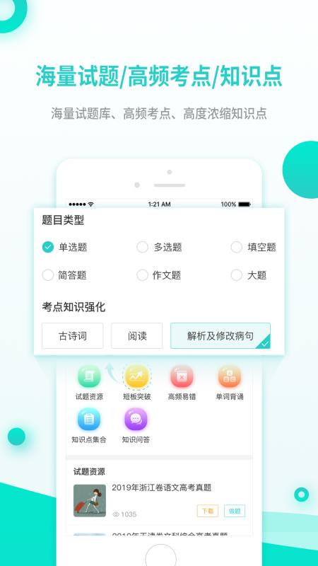 2、海量高中各科目试题任详细,海量试题库题目每天在线练;