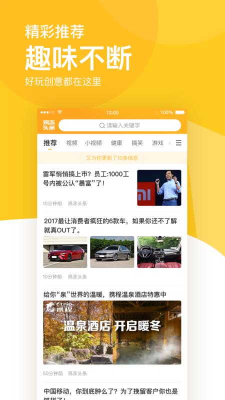鸡冻头条app上趣味头条资讯,精彩热点内容刷不完。影视娱乐游戏生活等精彩头条内容全覆盖。分享有奖,红包不断,边笑边赚,鸡冻头条比你想得更有趣。聚集搞笑段子,覆盖海量精彩短视频,让你笑得停不下来。好玩、好看、有趣,还能赚零花钱。在本应用拥有众多的资讯,全部是由应用提供的大量有趣资讯内容,让你可以爆笑不断,应用提供大量的游戏娱乐资讯让你热血激荡;应用会为客户推荐各行各业的爆笑资讯,各大头条资讯内容用户都可以进行使用,精选的段子,搞笑图片为用户进行推荐,分享还会有好礼获得,礼品奖金不断,越读越激动,好玩又有趣的软件,需要的用户可以来进行下载。