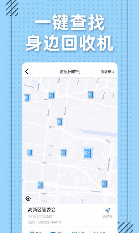 3、地图寻找附近回收机,智能标记回收机位置,可通过导航的方式前往线下回收机地址;