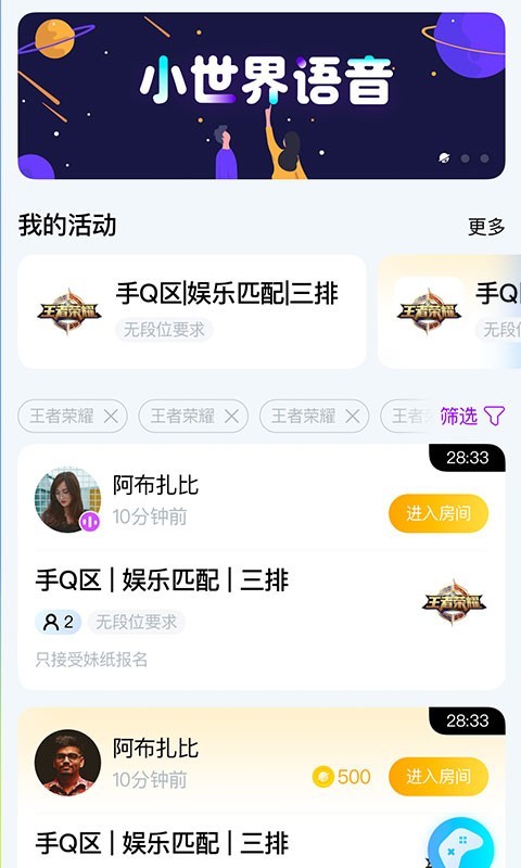 小世界语音是一款比较有意思的交友平台,整个界面的设计超清爽整洁,操作系统也很友好,功能多样,还有丰富有趣的社交玩法,给大家完全不一样的交友体验,随时偶遇属于你的小世界,在你感兴趣的圈子里认识更多志同道合的伙伴,还能无意间就遇到良人从此脱单哦,认识有趣的人,发现异样的美,互动交心拉近与陌生人的距离。枯燥的生活需要新鲜感,孤单的日子需要改变,精致的朋友圈需要扩展。改变沉闷的社交现状,提高交友成功率,扩大交友圈,用好听的声音排解孤单,小世界陪伴你的每一天!喜欢的朋友可以来下载了解哦!