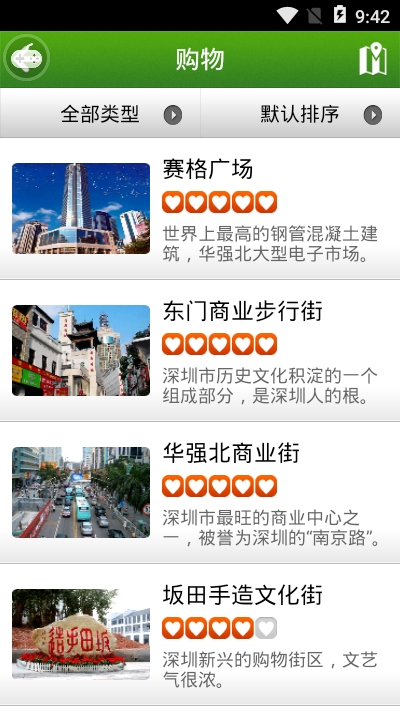 深圳旅游指南app,这是一款专门为去深圳旅游的用户打造的旅游指南应用平台,当用户决定去这儿旅游,却发现自己根本找不到适合自己愉快玩耍的地点和美食时,可以在该应用平台上寻找合适的旅游攻略喔,特别是容易迷路的用户还可以根据它的语音导航找到自己预订的酒店餐厅等等。你可以在这里了解多种相关旅游内容,也可直接通过深圳旅游指南app预定各种酒店和饭店,这里必然有丰富多彩的生活等你。