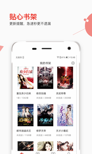 1.贴心书架超大容量书架,阅读记录云同步,章节更新实时提醒,一章一节不遗漏