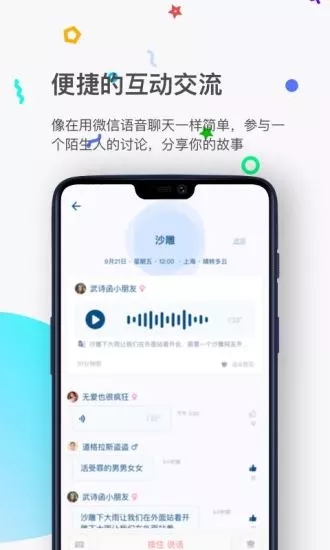 便捷的互动交流,像在用微信语音聊天一样简单,参与一个陌生人的讨论,分享你的故事