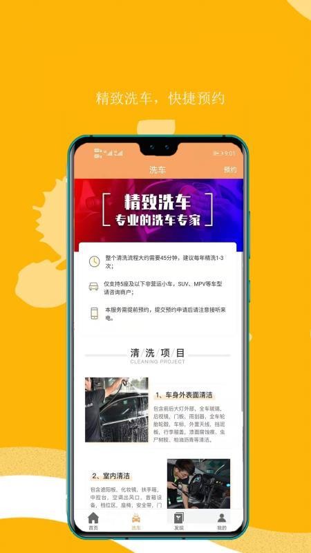 3、应用中有洗车服务,让用户了解洗车的详细流程,为用户更细致的进行车辆清洗;