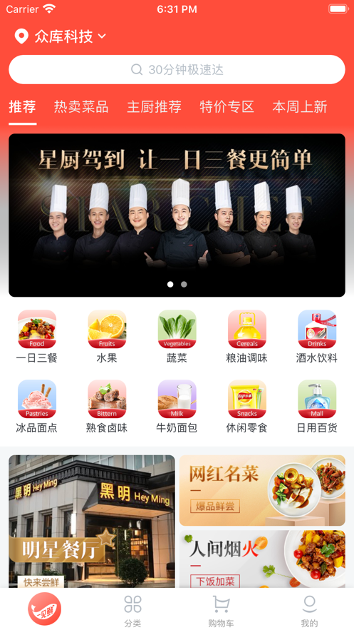 3.将新鲜蔬菜、肉类、水产、配料等按五星级酒店主厨设计的菜品组合搭配。免洗免切,为用户节约更多时间、享受轻松、高效、有趣的烹饪体验。