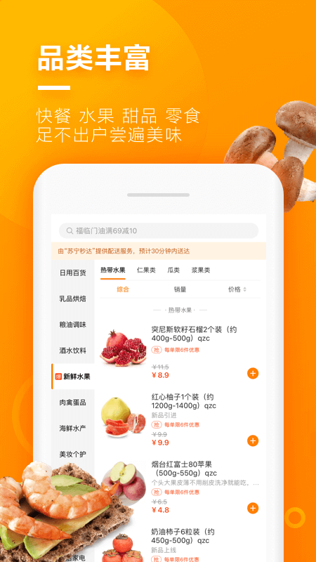 足不出户吃遍周边,一小时极速送达!我们提供生鲜水果、零食饮料、早餐便当、美食外卖、生活服务,新鲜生活送到家!新用户注册即送超值优惠券,嗨购全场。苏宁小店app是一款便捷的社区O2O便利店服务平台,为用户提供便捷的生鲜零售商品购买,用户通过平台可以下单购买各种商品,1小时上门送货,还有便捷的快递代收、家庭理财服务,每一样商品都经过重重选择,保证质量。最有效的团队为您服务,下单后1小时内保证送达,需要的用户就快下载吧!