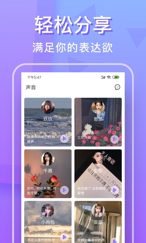 3、用声音认识彼此,让更多用户都能找到自己喜欢的声音并且成为朋友。
