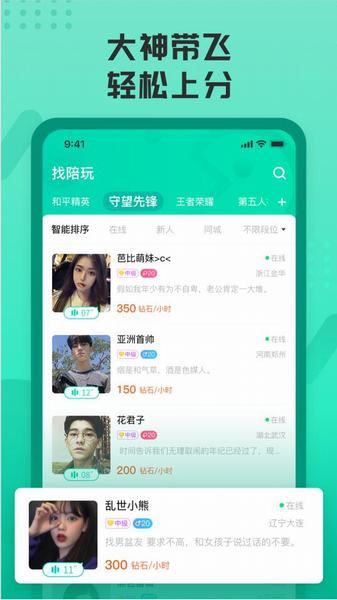 3、绝对的真人在线陪玩,让你玩游戏不再孤单,同时还可以有大神带;