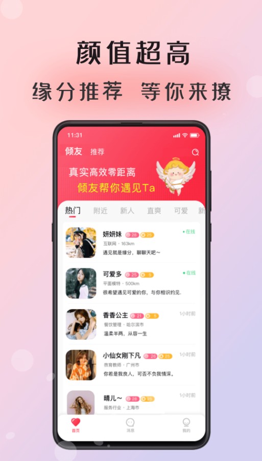 倾友交友APP是一款可以扩大我们社交圈的软件,也是现在很多用户们都关注的线上交友平台,在这里大家随时都可以找到跟你志同道合的朋友一起来聊天,汇集了各地的优质异性,大家也能在手机上来轻松互动聊天,也可以在手机上轻松找到属于自己的另一半,还可以根据用户们的需求为你匹配。更为丰富的话题的提供,让你更好的参与到你喜欢的话题内容,更多优质的用户,一起更好的信息话题的探讨和学习。