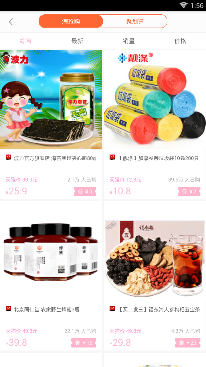 1、品类丰富、大额优惠劵、促销商品、1折疯抢等功能。