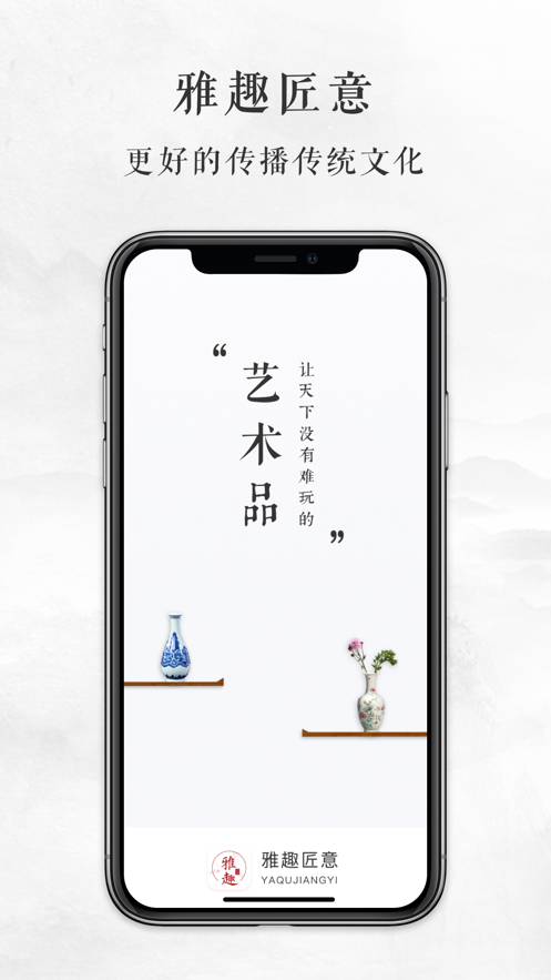 雅趣在古代分为“四雅”,花道、茶道、香道、挂画。匠意为匠人精神,因而命名为雅趣匠意。包含有茶道、花道、香道、文房、书画篆刻、陶瓷紫砂、文玩杂项、珠宝玉石、钱币、宗教文化、民俗装饰等11大门类。具有查看商品、商品搜索、浏览、购买、拍卖、收藏、支付、物流查询、在线沟通等功能,是一个方便商家和用户的综合性艺术品交易平台。