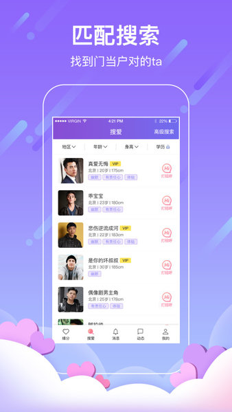 当你逢年过节被亲人问婚姻的时候,找对象可以快速帮你3天找到生命的有缘人,当你因为忙于工作还是单身的时候,找对象帮你随时随地发现身边适合你的人 ,找对象软件功能非常丰富,各种设计都很贴心,是为广大单身朋友提供的社交聊天平台,让你在摆脱单身的队伍,这里有不一样的挑战,可以真真切切找到属于自己的另一半,随时随地发现同城的单身男女,一键打招呼功能,方便快捷;高级搜索同城、老乡、职业、学历,快速精确找到适合你的缘分。