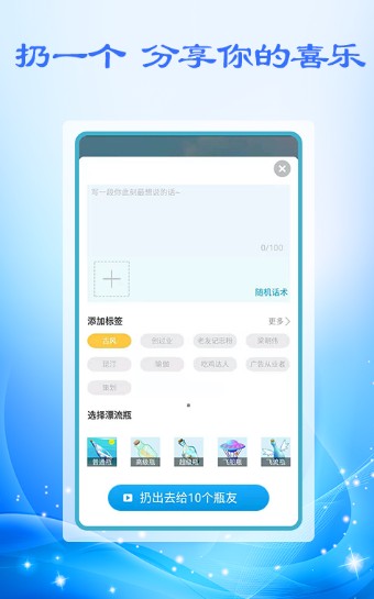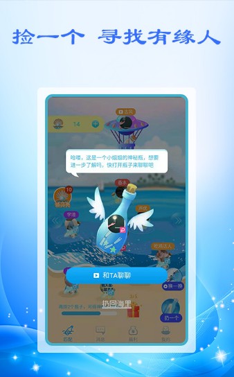 1、随时打开手机就可以与用户在线互动交流,主要就是通过漂流瓶的方式来聊天,非常的有趣;