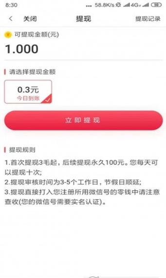 2、在福星宝上面得到的奖励首次只需要满0.3元就可以提现,提现一般24小时到账;