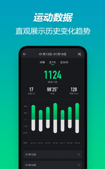 1、能够准确的记录大家跳绳的运动数据信息,比如每次跳绳消耗多少能量,平均跳绳所用时间。