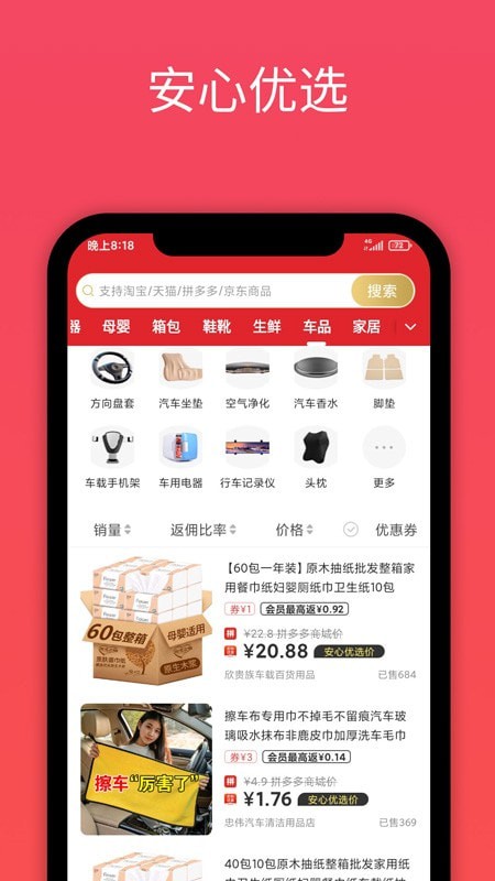 安心优选是一款网购平台,为用户带来海量的商品资源,提供丰富的品类选择,能轻松购买到你喜欢的资源,平台里面的各类商品都是第一时间更新的,该软件不仅能买到当下最流行热门的各种服装鞋帽等商品,还能随时随地查找到日常生活中常用的各种百货工具,同时里面的商品提供了各种购买返利以及优惠券等优惠福利,快来麦氪派站下载吧。