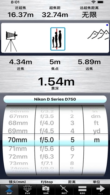 2. 手动设定画幅、光圈、镜头焦距和对焦点距离后,标识出近景深和远景深