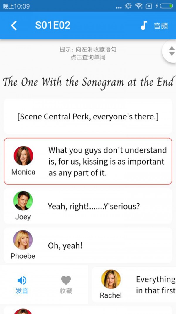 精精通老友记是一款非常新颖高效率的英语学习软件,以经典的美剧老友记为背景,各位朋友们可以在这里进行音频英语学习,实时的同步字幕,还可以调节语速,把握最佳节奏,快速查单词和翻译,在这里汇集了海量美剧的经典台词,能够帮助用户在这里学习口语和听力内容,随时可以设置素材播放语速,帮助用户更好掌握英语,最正宗的美式英语等你来学习,快来麦氪派站下载吧。