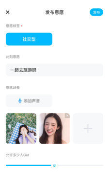 1、自定义发布意愿,包括意愿标签、此刻意愿、意愿场景、允许多少人get等信息;