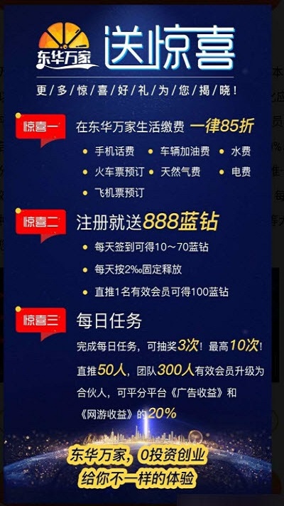 东华万家软件是一款以广告+网游+商城+生活缴费85折+理财为一体的推广软件,简单又好用,界面风格也是很简单的那种,选择适用于你的推广方式吧,让你的商品和服务,能够被更多的人知道!结合星事物的项目理念,本着持币分红的本质,让自己手艺都可以变现,毕竟现在生意都不是很好做,只有你愿意把人脉什么的扩充起来就一定不会让你失望,帮助你去获得到报酬就是这么简单。每天还会有抽奖活动,丰厚的奖品等你来领,喜欢的朋友们赶紧来麦氪派下载吧!