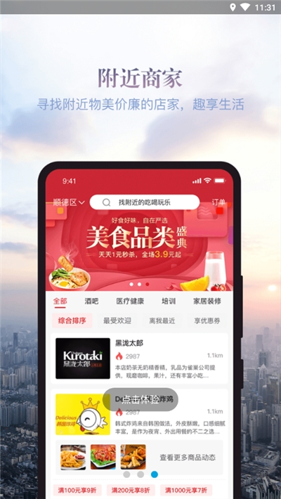 1、根据定位为你推荐附近的商家,可以在线预订或购买,并为你配送到家;